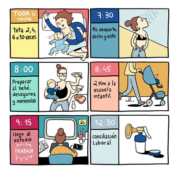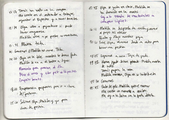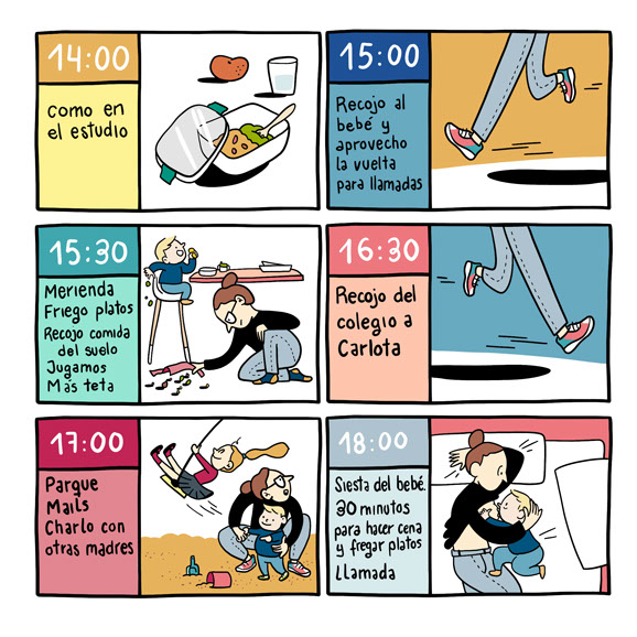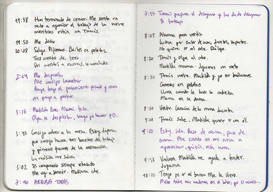 "Una vez mi padre, de esas veces que venía a visitarnos, me dijo ‘Que mal te organizas’, me cabree. Con cualquier tipo de ayuda a más de 800 kilómetros de distancia, un bebé en la teta, una niña de seis años queriendo jugar y aprender y un deadline le odié y le grité ‘Cómo te crees que se hace esto? Alguna vez has tenido que hacer todo a la vez?’ Le dije. Mi enfado tenía parte de razón, parte de rencor, parte de orgullo. Porque es verdad, me organizo fatal. Qué voy a decir, el caos es permanente. Un equilibrio entre la Madre y la Artista, la una quitándole minutos a la otra, luchando a cualquier momento del día.
